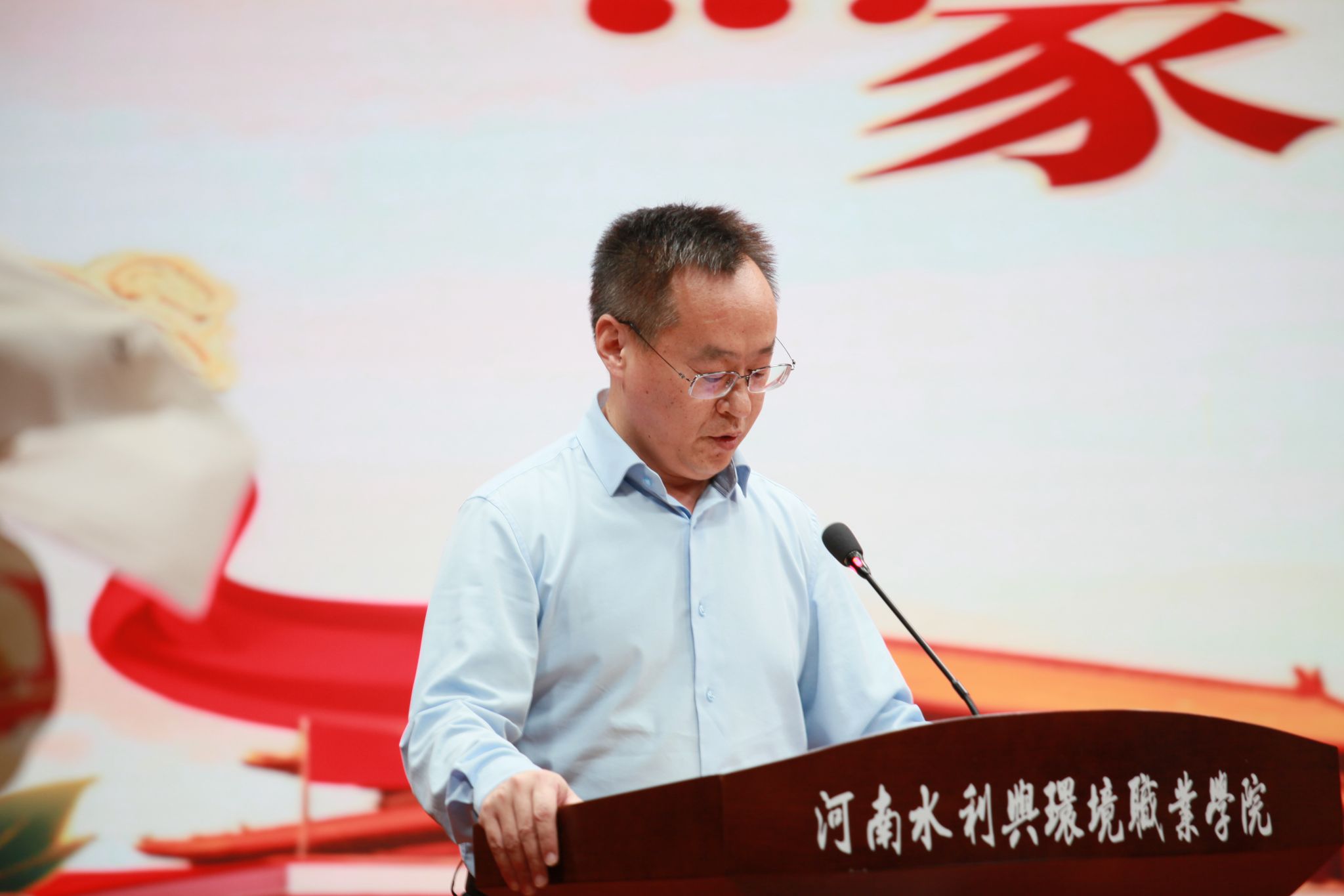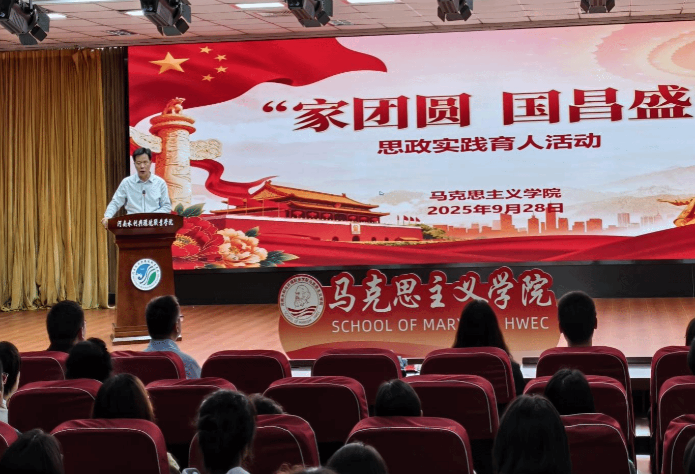 仪式上,王玉振为活动致辞,代表学校向全体师生致以诚挚的节日问候和美好祝愿,他指出十月份我校将迎来举办建校70周年成果展示活动,承办第十七届全国水利职业院校技能大赛两大盛事,庆祝双节的同时,大家共同见证学校的荣光时刻,并提出两点希望:一是希望老师们继续坚守初心,牢记育人使命;二是希望同学们在欢乐祥和的气氛中,感悟家国之情,强化责任担当。